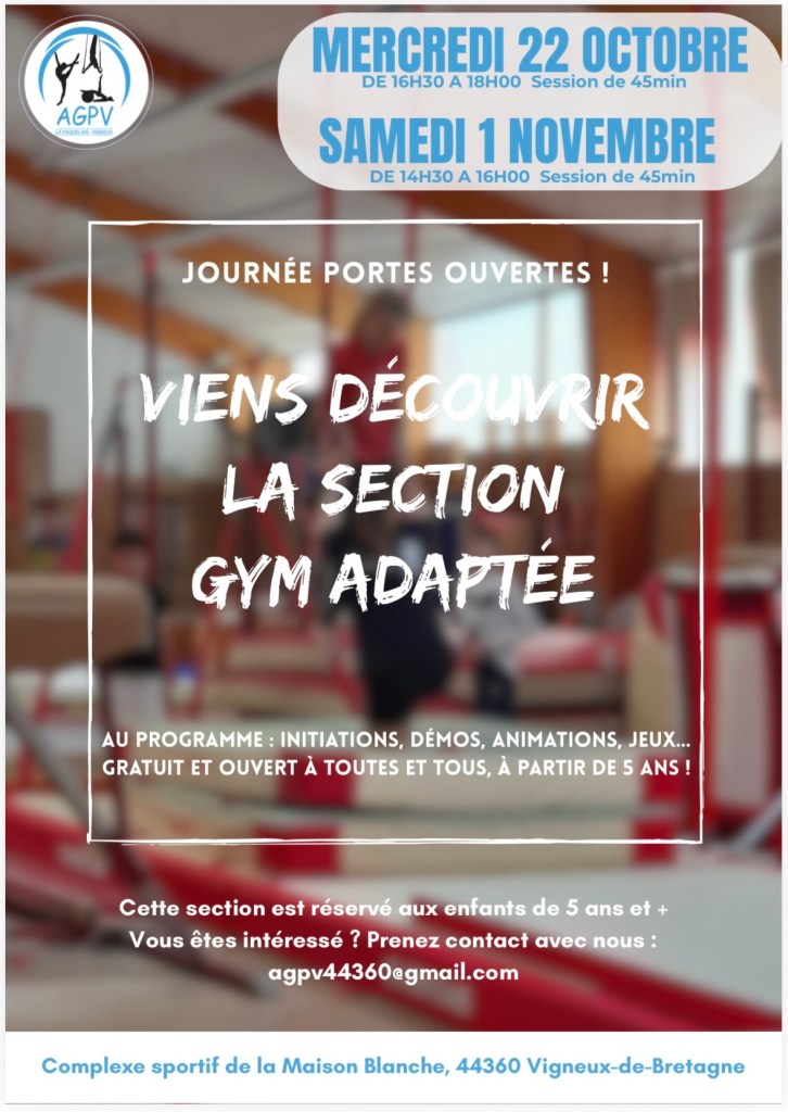 L’inclusion passe par le sport ! C’est une des convictions que nous portons au sein du club de gymnastique artistique de l’Amicale Gymnique la Paquelais Vigneux de Bretagne (AGPV), à travers la section sport adapté. La section ouvre ses portes le mercredi 22 Octobre de 16h30 à 18h et le samedi 1er Novembre de 14h30 à 16h00. Venez nous rencontrer pour découvrir cette discipline !