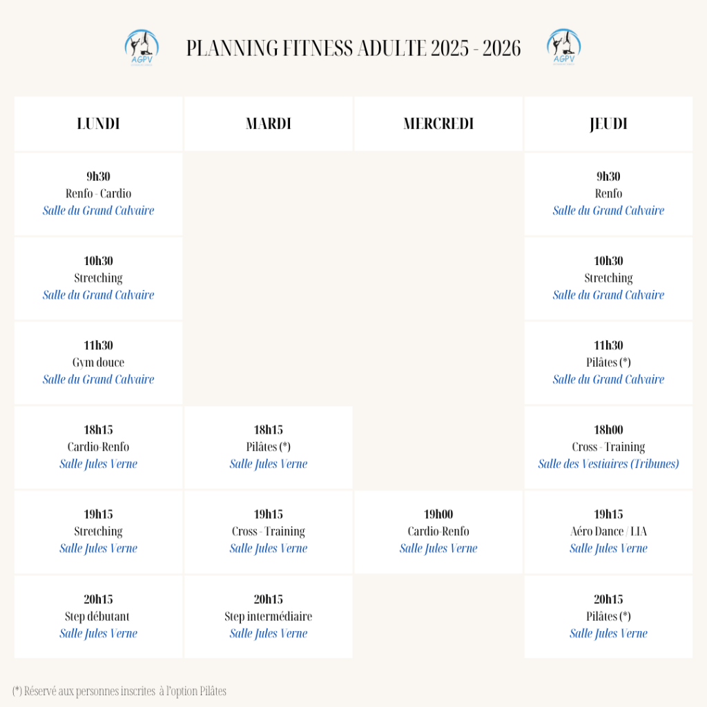 Les activités fitness de l’AGPV sont réservées aux personnes (hommes et femmes) de plus de 16 ans. Elles sont dispensées par notre salarié diplômé : Alexandre , ainsi que Gilles bénévole animateur fitness.